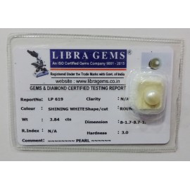 REPORT NO . LP 619CLARITY . N/ACOLOUR . SHINING WHITESHAPE / CUT . ROUNDWT . 3.84 CTSDIMENSION . 8-1.7-8.7-1.R . INDEX . N/AHARDNESS . 3.0COMMENT . PEARL..