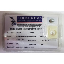 REPORT NO . LP 775CLARITY . N/ACOLOUR . SHINING WHITESHAPE / CUT . ROUNDWT . 3.92 CTSDIMENSION . 8-7.9-1.6-3.R . INDEX . N/AHARDNESS . 3.0COMMENT . PEARL..