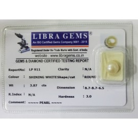 REPORT NO . LP 911CLARITY . N/ACOLOUR . SHINING WHITESHAPE / CUT . ROUNDWT . 3.87 CTSDIMENSION . 8-7.8-7.6-5.R . INDEX . N/AHARDNESS . 3.0COMMENT . PEARL..