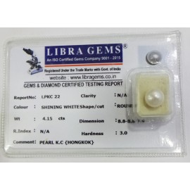 REPORT.NO.-LPKC 22CLARITY.-N/ACOLOUR.-SHINING WHITESHAPE/CUT.-ROUNDWT.-4.15 CTSDIMENSION.-8-8.8-8.7-9.R.INDEX.-N/AHARDNESS.-3.0COMMENT.-PEARL K.C { HONGKOK }..