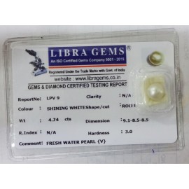 REPORT NO . LPV 9CLARITY . N/ACOLOUR . SHINING WHITESHAPE / CUT . ROUNDWT . 4.74 CTSDIMENSION . 9-1.8-5.8-5.R . INDEX . N/AHARDNESS . 3.0COMMENT . FRESH WATER PEARL { V }..