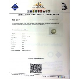 DATE:16-10-2023REF.NO:LPSC 271NAME:PEARLWEIGHT:5.48 CTSCOLOUR:SHINING WHITETYPE OF/CUT:ROUNDDIMENSION:9.6-9.6-8.4CONCLUSION:N/AHARDNESS:3.0R.INDEX:N/ACLARITY:N/ASPECIFIC COMMENTS:PEARL {SOUT..