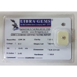 REPORT NO . LDM 20CLARITY . SI-1COLOUR . G-JSHAPE / CUT . ROUNDWT . 0.36 CTSDIMENSION . 4-6.2-9.4-6.R . INDEX . 2.42HARDNESS . 10.0COMMENT . DIAMOND..
