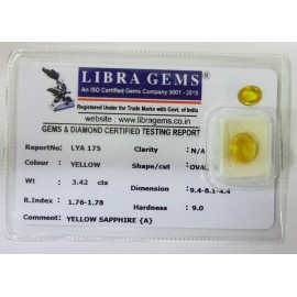 REPORT.NO.-LYA 138CLARITY.-N/ACOLOUR.-YELLOWSHAPE/CUT.-OVALWT.-3.61 CTSDIMENSION.-1-6.8-5.3-5.R.INDEX.-1.76-1.78HARDNESS.-9.0COMMENT.-YELLOW SAPPHIRE { A }..