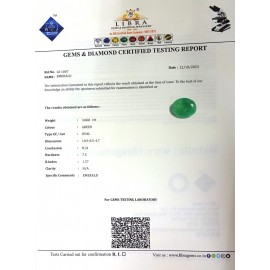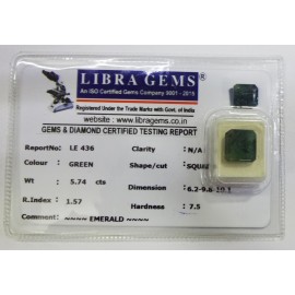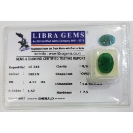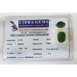 REPORT NO . LE 34CLARITY . N/ACOLOUR . GREENSHAPE / CUT . OVALWT . 5.02 CTSDIMENSION . 1-9.8-7.6-6.R . INDEX . 1.57HARDNESS . 7.5COMMENT . EMERALD..