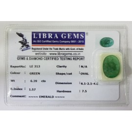 REPORT.NO.-LE 313CLARITY.-N/ACOLOUR.-GREENSHAPE/CUT.-OVALWT.-6.39 CTSDIMENSION.-6.1-2.1-4.6R.INDEX.-1.57HARDNESS.-7.5COMMENT.-EMERALD..