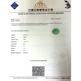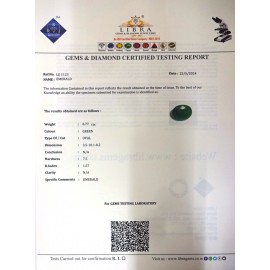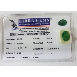 REPORT NO . LE 12CLARITY . N/ACOLOUR . GREENSHAPE / CUT . OVALWT . 3.90 CTSDIMENSION . 1-9.8-8.5-7.R . INDEX . 1.57HARDNESS . 7.5COMMENT . EMERALD..