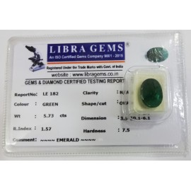 REPORT.NO.-LE 182CLARITY.-N/ACOLOUR.-GREENSHAPE/CUT.-OVALWT.-5.73 CTSDIMENSION.-3.5-10.1-6.1R.INDEX.-1.57HARDNESS.-7.5COMMENT.-EMERALD..