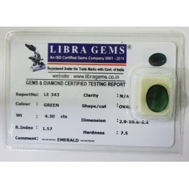 REPORT.NO.-LE 343CLARITY.-N/ACOLOUR.-GREENSHAPE/CUT.-OVALWT.-4.30 CTSDIMENSION.-2.9-10.6-4.4R.INDEX.-1.57HARDNESS.-7.5COMMENT.-EMERALD..