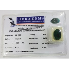 REPORT.NO.-LE 280CLARITY.-N/ACOLOUR.-GREENSHAPE/CUT.-OVALWT.-5.25 CTSDIMENSION.-3-8.9-1.5-9.R.INDEX.-1.57HARDNESS.-7.5COMMENT.-EMERALD..