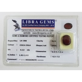 REPORT.NO.-LH 398CLARITY.-N/ACOLOUR.-COCA COLASHAPE/CUT.-OVALWT.-4.12 CTSDIMENSION.-2-1.9-7.3-4.R.INDEX.-1.92-2.02HARDNESS.-6.5-7.5COMMENT.-HESSONITE ..