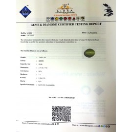 REPORT.NO.-LC 566CLARITY.-N/ACOLOUR.-L.GREENSHAPE/CUT.-OVALWT.-8.65 CTSDIMENSION.-4-4.9-3.8-7.R.INDEX.-1.54-1.55HARDNESS.-7.5COMMENT.-CATS EYE { S. QUARTZ }..
