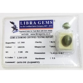 REPORT.NO.-LC 360CLARITY.-N/ACOLOUR.-GREENSHAPE/CUT.-OVALWT.-7.00 CTSDIMENSION.-1-4.10-5.8-2.R.INDEX.-1.54-1.55HARDNESS.-7.5COMMENT.-CATS EYE { S . QUARTZ }..