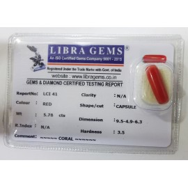 REPORT NO. LCI 41CLARITY. N/ACOLOUR. REDSHAPE/CUT. CAPSULEWT. 5.78 CTSDIMENSION. 9.5-4.9-6.3R. INDEX. N/AHARDNESS. 3.5COMMENT. CORAL..