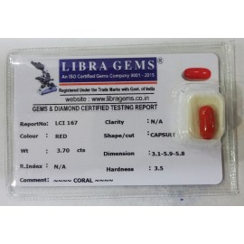 REPORT NO . LCI 365CLARITY . N/ACOLOUR . REDSHAPE / CUT . OVALWT . 3.65 CTSDIMENSION . 3-5.6-1.5-1.R . INDEX . N/AHARDNESS . 3.5COMMENT . CORAL..