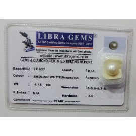 REPORT NO . LP 637CLARITY . N/ACOLOUR . SHINING WHITESHAPE / CUT . ROUNDWT . 4.45 CTSDIMENSION . 8-5.8-6.7-8.R . INDEX . N/AHARDNESS . 3.0COMMENT . PEARL..