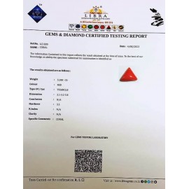 REPORT NO . LCI 32CLARITY . N/ACOLOUR . REDSHAPE / CUT . CAPSULEWT . 4.77 CTSDIMENSION . 7-9.6-3.4-3.R . INDEX . N/AHARDNESS . 3.5COMMENT . CORAL..