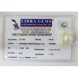 REPORT NO . LP 283CLARITY . N/ACOLOUR . SHINING WHITESHAPE / CUT . ROUNDWT . 8.26 CTSDIMENSION . 1-6.1-4.7-9.R . INDEX . N/AHARDNESS . 3.0COMMENT . PEARL..