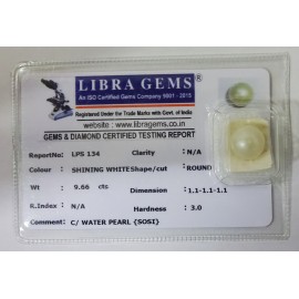 REPORT NO . LPS 134CLARITY . N/ACOLOUR . SHINING WHITESHAPE / CUT . ROUNDWT . 9.66 CTSDIMENSION . 1-1.1-1.1-1.R . INDEX . N/AHARDNESS . 3.0COMMENT . C / WATER PEARL { SOSI }..