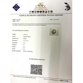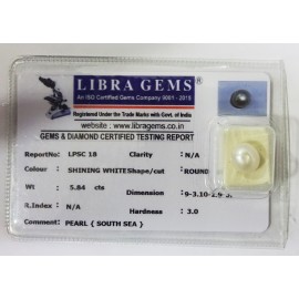 REPORT NO . LPSC 18CLARITY . N/ACOLOUR . SHINING WHITESHAPE / CUT . ROUNDWT . 5.84 CTSDIMENSION . 9-3.10-2.9-3.R . INDEX . N/AHARDNESS . 3.0COMMENT . PEARL { SOUTH SEA }..