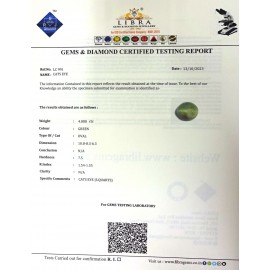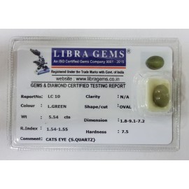 REPORT NO . LC 10CLARITY . N/ACOLOUR . L . GREENSHAPE / CUT . OVALWT . 5.54 CTSDIMENSION . 1-8.9-1.7-2.R . INDEX . 1.54-1.55HARDNESS . 7.5COMMENT . CATS EYE { S . QUARTZ }..