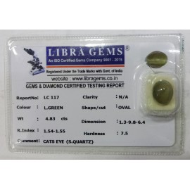 REPORT NO . LC 117CLARITY . N/ACOLOUR . L . GREENSHAPE / CUT . OVALWT . 4.83 CTSDIMENSION . 1-3.9-8.6-4.R . INDEX . 1.54-1.55HARDNESS . 7.5COMMENT . CATS EYE { S . QUARTZ }..