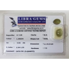 REPORT NO . LC 128CLARITY . N/ACOLOUR . L . GREENSHAPE / CUT . OVALWT . 5.02 CTSDIMENSION . 1-1.9-5.6-9.R . INDEX . 1.54-1.55HARDNESS . 7.5COMMENT . CATS EYE { S . QUARTZ }..