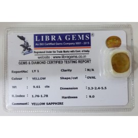REPORT NO . LY 1CLARITY . N/ACOLOUR . YELLOWSHAPE / CUT . OVALWT . 9.61 CTSDIMENSION . 3-3.2-4.5-5.R . INDEX . 1.76-1.78HARDNESS . 9.0COMMENT . YELLOW SAPPHIRE..