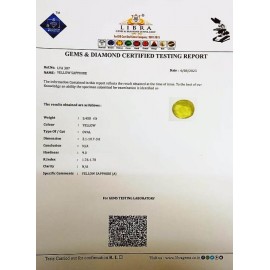 REPORT.NO.-LYA 203CLARITY.-N/ACOLOUR.-YELLOWSHAPE/CUT.-OVALWT.-7.20 CTSDIMENSION.-2-2.9-6.6-1.R.INDEX.-1.76-1.78HARDNESS.-9.0COMMENT.-YELLOW SAPPHIRE { A }..