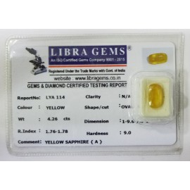REPORT.NO.-LYA 114CLARITY.-N/ACOLOUR.-YELLOWSHAPE/CUT.-OVALWT.-4.26 CTSDIMENSION.-1-9.6-7.5-1.R.INDEX.-1.76-1.78HARDNESS.-9.0COMMENT.-YELLOW SAPPHIRE { A }..