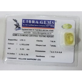 REPORT NO . LYS 3CLARITY . N/ACOLOUR . L . YELLOWSHAPE / CUT . OVALWT . 5.55 CTSDIMENSION . 2-1.7-5.5-8.R . INDEX . 1.76-1.78HARDNESS . 9.0COMMENT . YELLOW SAPPHIRE { S }..