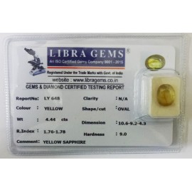 REPORT.NO.LY 648CLARITY.N/ACOLOUR.YELLOWSHAPE/CUT.OVALWT.4.44 CTSDIMENSION.10.6-9.2-4.3R.INDEX.1.76-1.78HARDNESS.9.0COMMENT.YELLOW SAPPHIRE..