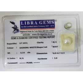 REPORT NO. 1031CLARITY. N/ACOLOUR. SHINING WHITESHAPE/CUT. ROUNDWT. 4.14 CTSDIMENSION. 8.9-8.7-6.5R.INDEX. N/AHARDNESS. 3.0COMMENT. PEARL ..
