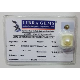 REPORT NO . LP 680CLARITY . N/ACOLOUR . SHINING WHITESHAPE / CUT . ROUNDWT . 3.83 CTSDIMENSION . 8-2.8-2.7-1.R . INDEX . N/AHARDNESS . 3.0COMMENT . PEARL..