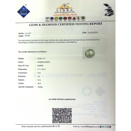REPORT.NO.LPSC 144CLARITY.N/ACOLOUR.SHINING WHITESHAPE/CUT.ROUND WT.7.04 CTSDIMENSION.10.1-9.8-9.9R.INDEX.N/AHARDNESS.3.0COMMENT.PEARL {SOUTH SEA}..