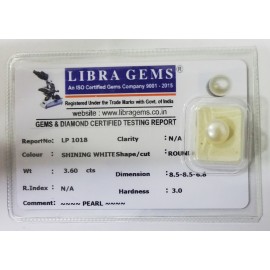 REPORT NO . LP 1018CLARITY . N/ACOLOUR . SHINING WHITESHAPE / CUT . ROUNDWT . 3.60 CTSDIMENSION . 8-5.8-5.6-8.R . INDEX . N/AHARDNESS . 3.0COMMENT . PEARL..