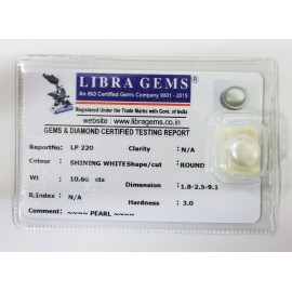 REPORT NO . LP220CLARITY . N/ACOLOUR . SHINING WHITESHAPE / CUT . ROUNDWT . 10.60 CTSDIMENSION . 1-8.2-5.9-1.R . INDEX . N/AHARDNESS . 3.0COMMENT . PEARL..