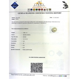 REPORT.NO.LPSC 142CLARITY.N/ACOLOUR.SHINING WHITESHAPE/CUT.ROUND WT.6.57 CTSDIMENSION.9.9-9.9-9.7R.INDEX.N/AHARDNESS.3.0COMMENT.PEARL {SOUTH SEA}..
