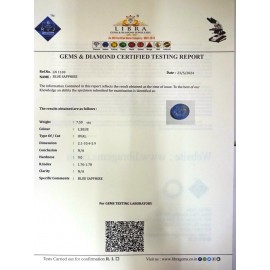 REPORT.NO.-LN 556CLARITY.-N/ACOLOUR.-BLUESHAPE/CUT.-OVALWT.-7.73 CTSDIMENSION.-4-4.1-9.4-8.R.INDEX.-1.76-1.78HARDNESS.-9.0COMMENT.-BLUE SAPPHIRE..