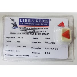 REPORT. NO. LCI 58CLARITY. N/ACOLOUR. REDSHAPE/CUT. TRIANGLEWT. 3.06 CTSDIMENSION. 10.1-9.4-5.6R. INDEX. N/AHARDNESS. 3.5COMMENT. CORAL..