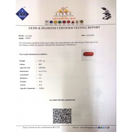 REPORT NO . LCI 209CLARITY . N/ACOLOUR . REDSHAPE / CUT . CAPSULEWT . 3.98 CTSDIMENSION . 6-2.5-6.4-3.R . INDEX . N/AHARDNESS . 3.5COMMENT . CORAL..