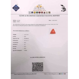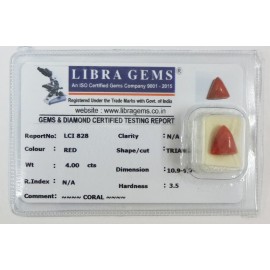 REPORT NO . LCI 157CLARITY . N/ACOLOUR . REDSHAPE / CUT . TRIANGLEWT . 4.41 CTSDIMENSION . 2-4.1-4.5-4.R . INDEX . N/AHARDNESS . 3.5COMMENT . CORAL..