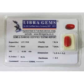 REPORT NO . LCI 358CLARITY . N/ACOLOUR . REDSHAPE / CUT . OVALWT . 4.66 CTSDIMENSION . 1-9.6-7.6-5.R . INDEX . N/AHARDNESS . 3.5COMMENT . CORAL..