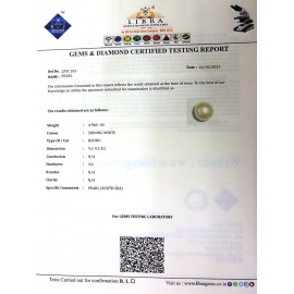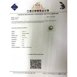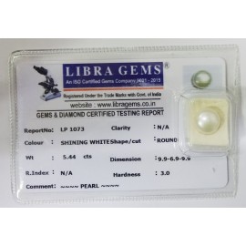 REPORT NO . LP 1073CLARITY . N/ACOLOUR . SHINING WHITESHAPE / CUT . ROUNDWT . 5.44 CTSDIMENSION . 9-9.6-9.9-9.R . INDEX . N/AHARDNESS . 3.0COMMENT . PEARL..