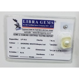 REPORT NO . LP 611CLARITY . N/ACOLOUR . SHINING WHITESHAPE / CUT . ROUNDWT . 3.52 CTSDIMENSION . 8-2.8-1.6-6.R . INDEX . N/AHARDNESS . 3.0COMMENT . PEARL..