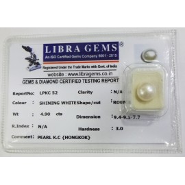 REPORT.NO.-LPKC 52CLARITY.-N/ACOLOUR.-SHINING WHITESHAPE/CUT.-ROUNDWT.-4.90 CTSDIMENSION.-9-4.9-1.7-7.R.INDEX.-N/AHARDNESS.-3.0COMMENT.-PEARL K.C { HONGKOK }..