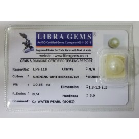 REPORT NO . LPS 118CLARITY . N/ACOLOUR . SHINING WHITESHAPE / CUT . ROUNDWT . 10.65 CTSDIMENSION . 1-3.1-2.1-3.R . INDEX . N/AHARDNESS . 3.0COMMENT . C / WATER PEARL { SOSI }..