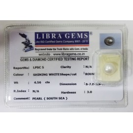 REPORT NO . LPSC 5CLARITY . N/ACOLOUR . SHINING WHITESHAPE / CUT . ROUNDWT . 4.56 CTSDIMENSION . 8-7.8-4.8-7.R . INDEX . N/AHARDNESS . 3.0COMMENT . PEARL { SOUTH SEA }..