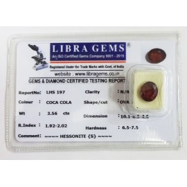 REPORT.NO.-LHS 197CLARITY.-N/ACOLOUR.-COCA COLASHAPE/CUT.-OVALWT.-3.56 CTSDIMENSION.-10-1.8-5.4-6.R.INDEX.-1.92-2.02HARDNESS.-6.5-7.5COMMENT.-HESSONITE { S }..