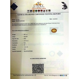 REPORT.NO.-LY 706CLARITY.-N/ACOLOUR.-YELLOWSHAPE/CUT.-OVALWT.-6.46 CTSDIMENSION.-2-1.10-4.4-1.R.INDEX.-1.76-1.78HARDNESS.-9.0COMMENT.-YELLOW SAPPHIRE..